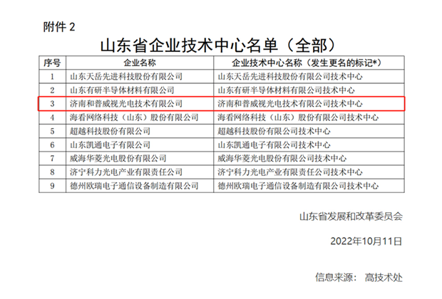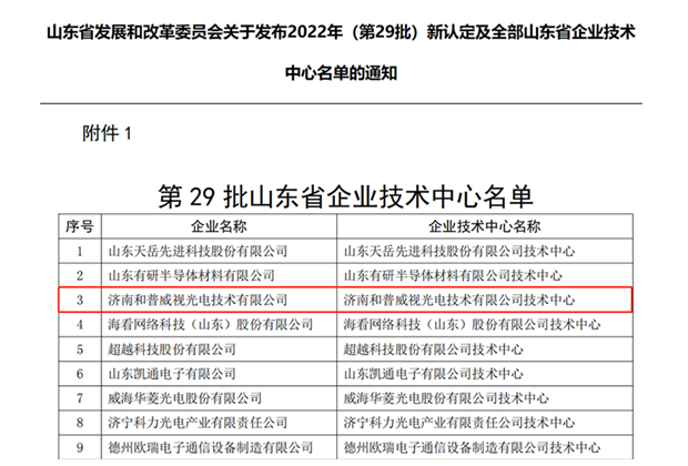 2022年10月11日,山东省发展和改革委员会发布通知:根据《山东省企业技术中心认定管理办法(2021年修订)》(鲁发改高技〔2021〕428号),经审定,确认162家企业技术中心自通知发布之日起具有省企业技术中心或分中心资格,济南和普威视光电技术有限公司成功获评。